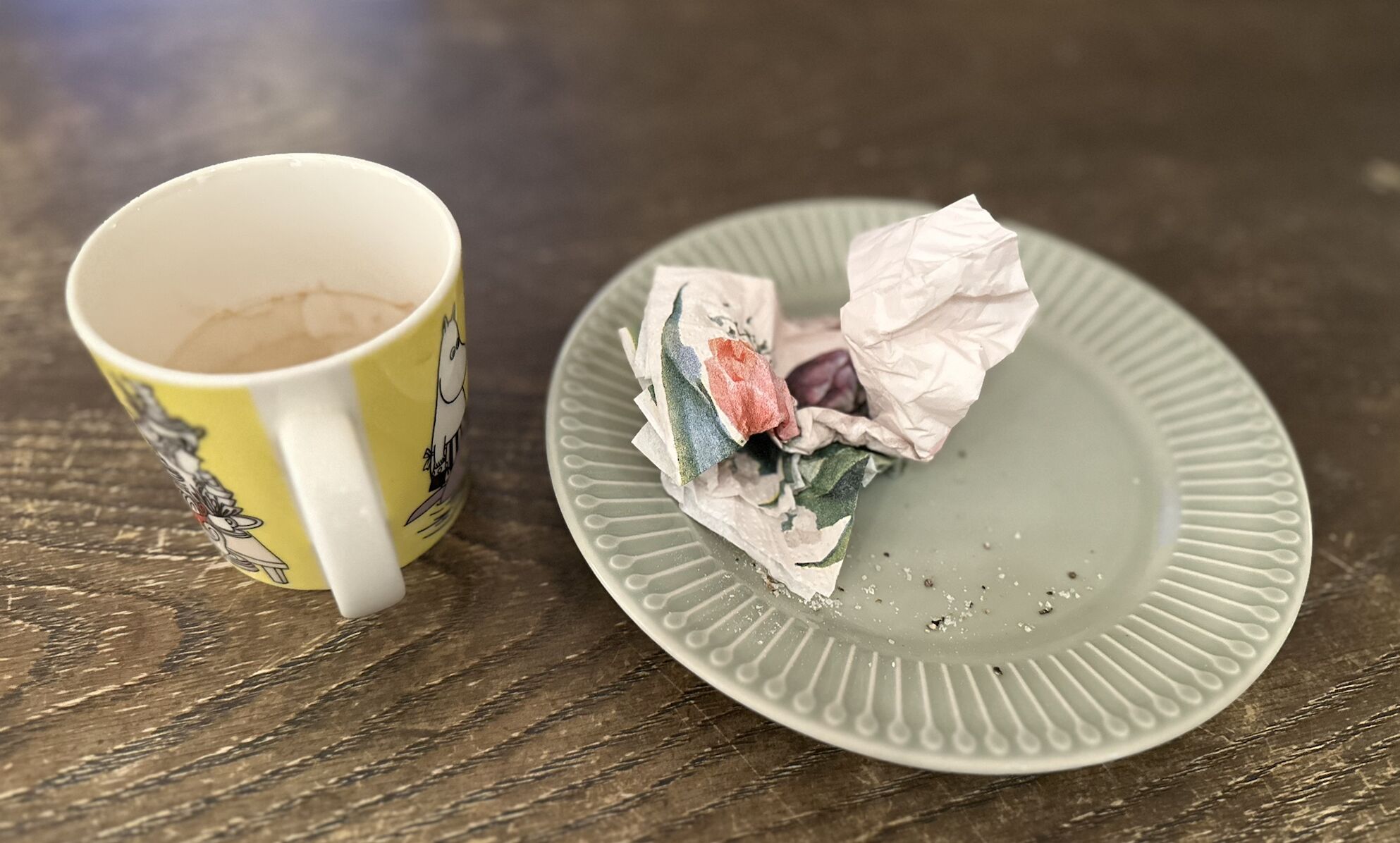 Ved siden av et fat med matrester og et krøllete serviett.