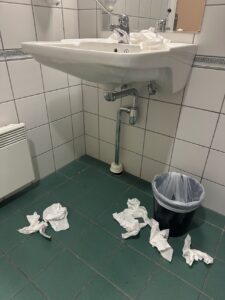 Jeg kom inn på toalettet og observerte at det kanskje var på tide at rengjøringspersonalet snart burde komme innom. Papiret fløt, og det var lite som var på stell rundt vasken. Søppelbøtta hadde heller ikke blitt truffet i det siste.