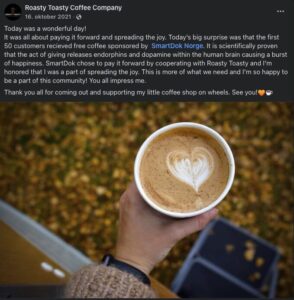 Ideen om å betale for den neste kaffen til en ukjent hadde vokst i meg over tid. Jeg tok derfor turen innom min daglige leder i Smartdok, Bjørn Tore for å lufte tanken min.